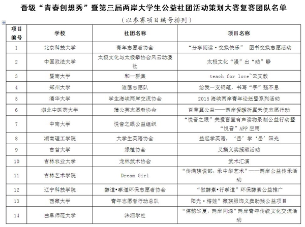 “青春创想秀”暨第三届两岸大学生公益社团活动策划大赛复赛晋级团队的通知-ag娱乐