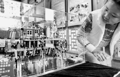 28日,一名小观众在参观台湾新竹明新科技大学学生设计的作品《多足仿生兽——移动圣诞家园》。新华社发